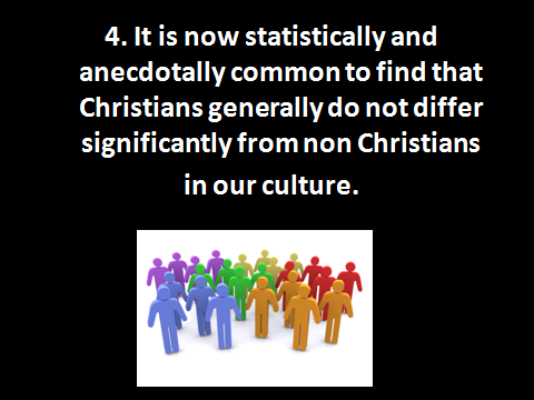 4) It is now statistically and anecdotally common to find that Christians generally do not differ significantly from non Christians in our culture.