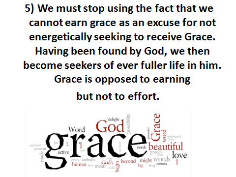 5) We must stop using the fact that we cannot earn grace as an excuse for not energetically seeking to receive Grace. Having been found by God, we then become seekers of ever fuller life in him. Grace is opposed to earning but not to effort.