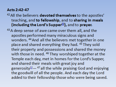 42 All the believers devoted themselves to the apostles’ teaching, and to fellowship, and to sharing in meals (including the Lord’s Supper[i]), and to prayer.