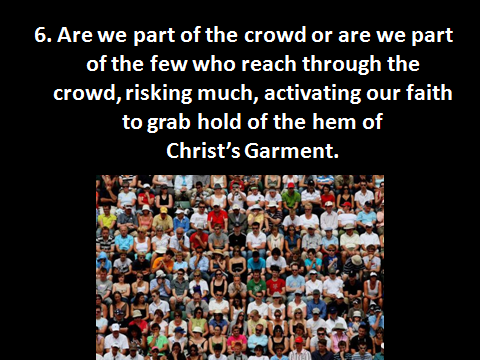 6) Are we part of the crowd or are we part of the few who reach through the crowd, risking much, activating our faith to grab hold of the hem of Christ’s Garment.
