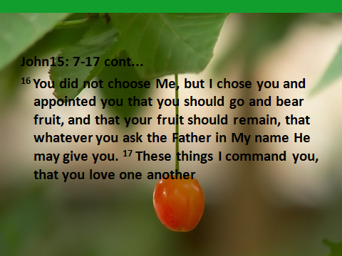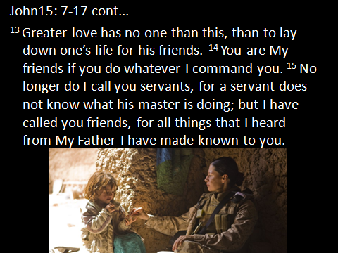 11 “These things I have spoken to you, that My joy may remain in you, and that your joy may be full. 12 This is My commandment, that you love one another as I have loved you. 13 Greater love has no one than this, than to lay down one’s life for his friends. 14 You are My friends if you do whatever I command you. 15 No longer do I call you servants, for a servant does not know what his master is doing; but I have called you friends, for all things that I heard from My Father I have made known to you. 16 You did not choose Me, but I chose you and appointed you that you should go and bear fruit, and that your fruit should remain, that whatever you ask the Father in My name He may give you. 17 These things I command you, that you love one another