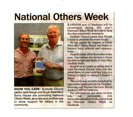 National Others Week has been an unequivocally successful project, from the first Launch function in Canberra to the newspaper stories on NOW projects we have just received.