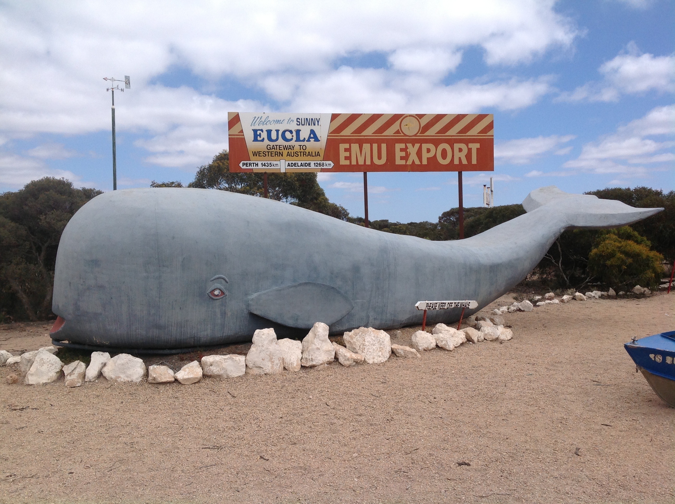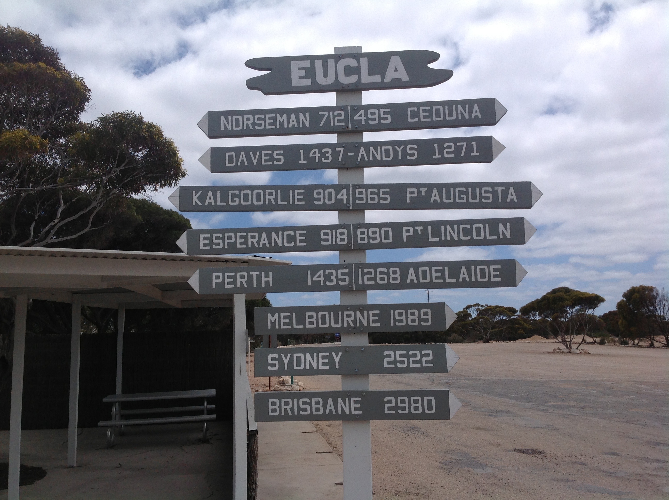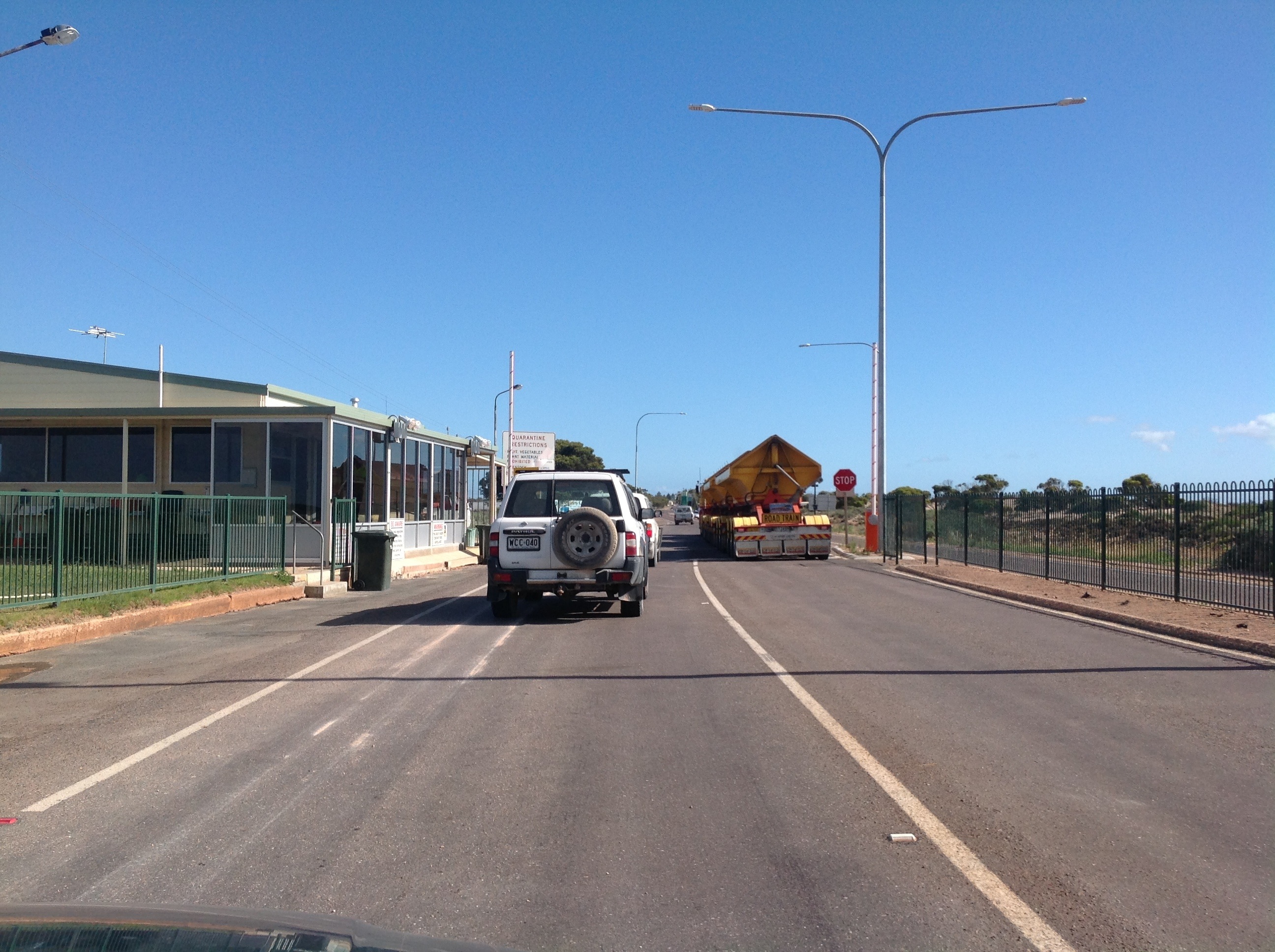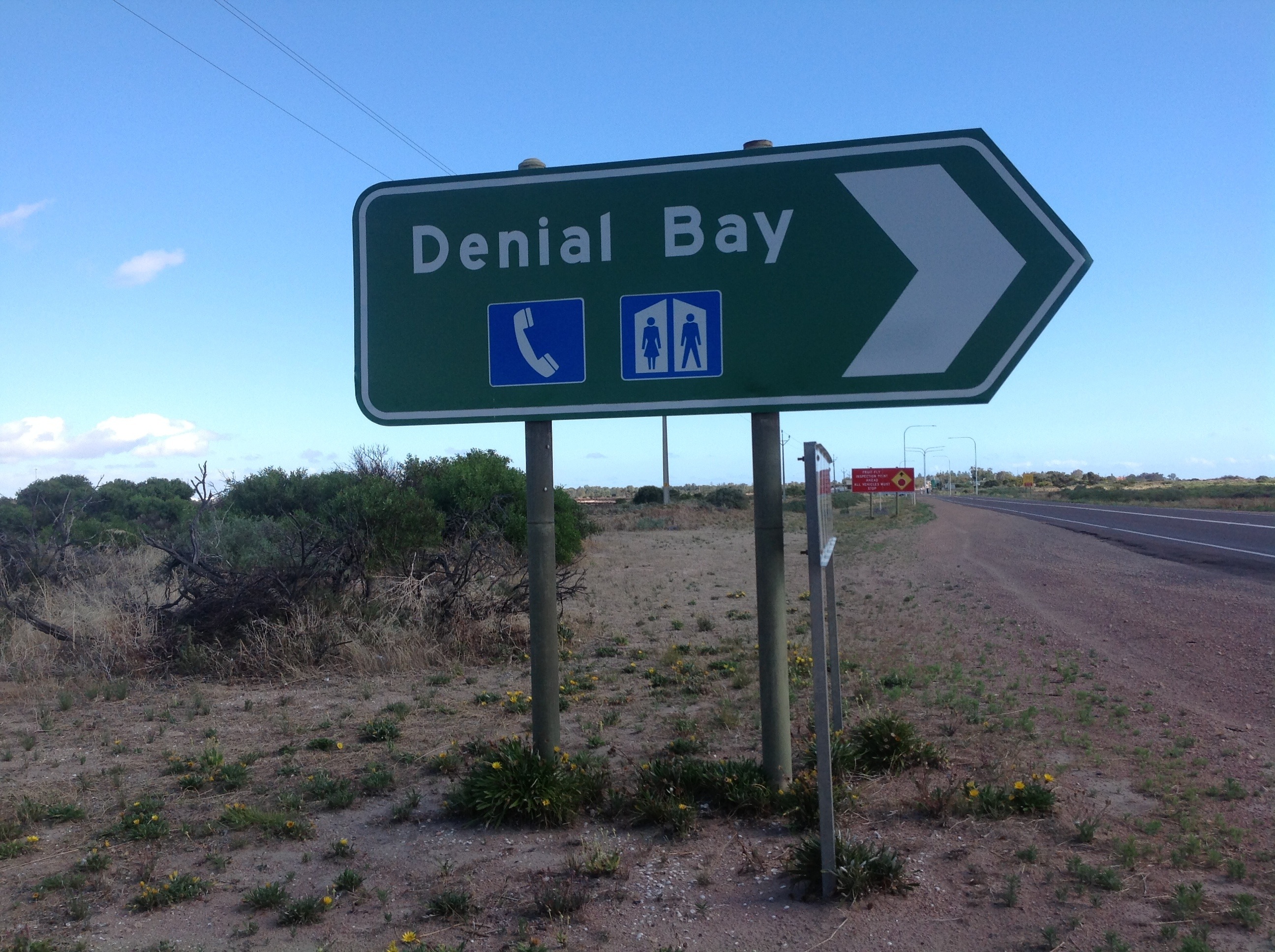 I ran into a bit of trouble at the fruit Quarantine Inspection Station at Ceduna. 200 metres up the road I drove passed a sign to Denial Bay. I thought that was a funny name and I thought, I know some people who live at Denial Bay. So I did a U turn and went back to take a photo. When I then went through the inspection station, I had to get out of the car, open everything up and was grilled over why I did a U turn and what had I dumped up the road. I guess I had acted suspiciously. Lol