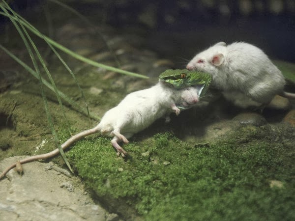 First up a story of courage and possibly love. A courageous mouse climbs onto the back of a snake as it bites another mouse during feeding time at a zoo in Zhejiang province, China.