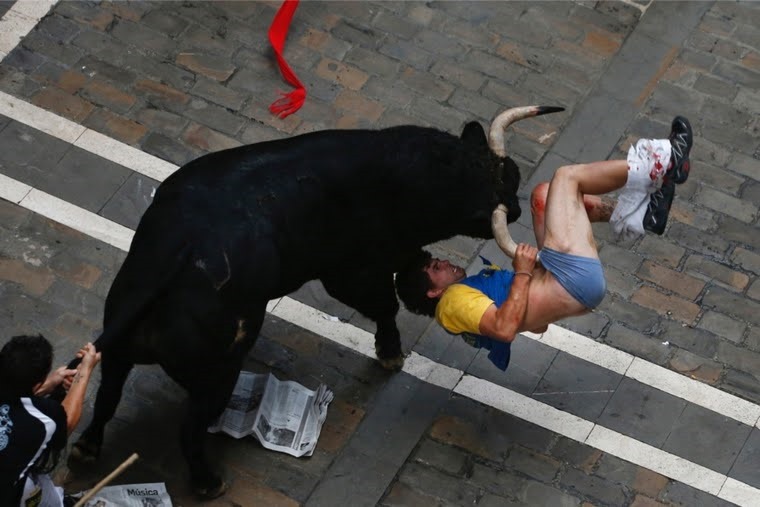 A runner named Diego Miralles is gored by a bull during the San Fermin festival in Pamplona.