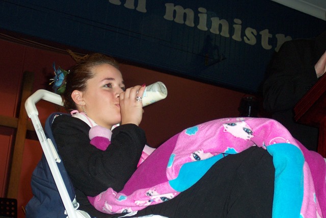 My point in this sermon illustration was that feeding a bottle to a 16 year old girl and putting her in a pram is just plain weird. So we don’t do that in normal life…so why do we tolerate immature Christians in the church: People who have been saved for 20 years but still have the maturity of a toddler? I appreciate the grace of Jonina Menzies who played the role of a spiritual baby…