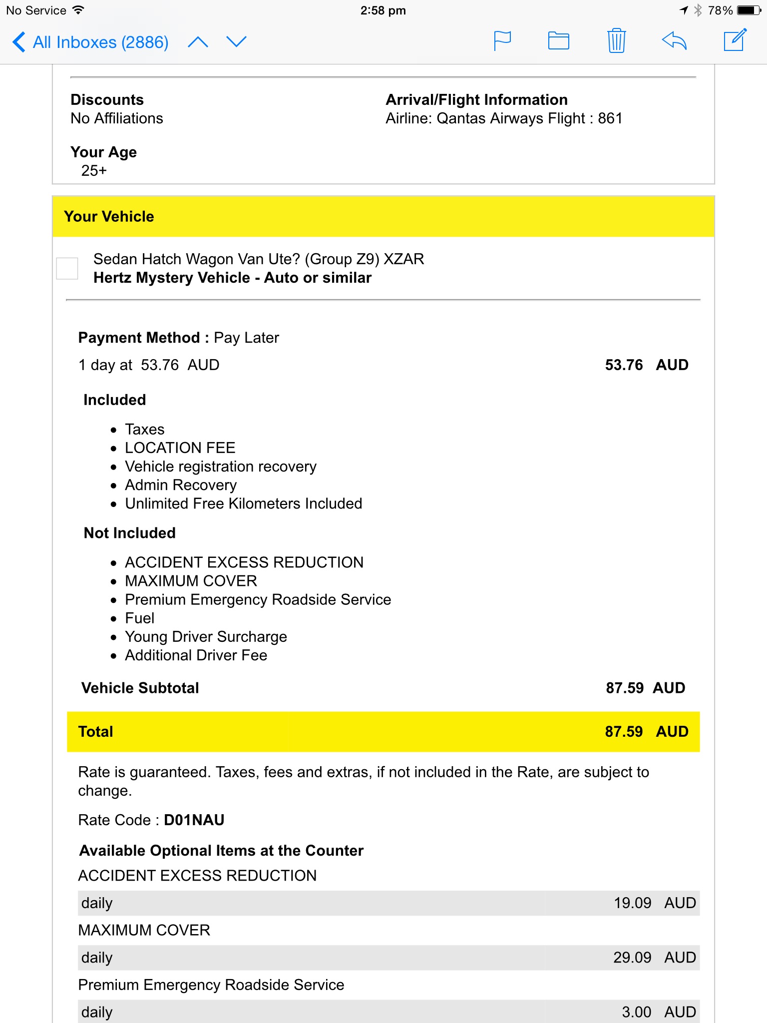 I am not real sharp on figures so please someone help me understand the online booking practices of Hertz Car Rental Company. Last night I booked a Hertz hire car for a six hour period today to be taken from Sydney Airport. The basic car fee was $53.76 and then after the additional things of taxes, location fee, vehicle registration recovery, admin recovery and giving me unlimited kilometers, the final cost was $87.59. Fair price I thought to myself and so I booked it and was given a booking reference number.