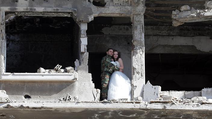 Syrian wedding couple pose for photos in war ravaged town. See pics and have a super day.