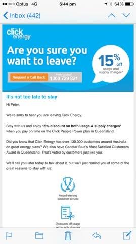 I have had a Click Energy Account for 5 years. When I moved to the Gold Coast I kept my account in Nowra, and opened an account for my Gold Coast rental…..Now that I have moved into another house I have decided to go with Origin Energy. So today Click Energy rang me to offer me cheaper electricity to entice me back (And then emailed, see Pic above). I asked the “Client Relations Operator” how come they didn’t offer me cheaper electricity as a longer term customer. They couldn’t explain this to me. I declined the cheaper offer out of principle. But trust me in a year I will be moving from Origin Energy and looking for the latest and greatest offer as I know Origin will screw me over too…..I used to be with them before Click.